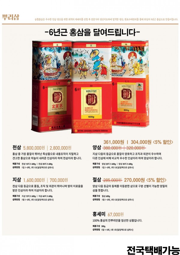 -상품명 : 농협홍삼한삼인 -상품소개 및 정보 : 홍삼 -상품가격 : 제품별상이, 사진참조 -회원제안가격 : 제품별상이, 사진참조