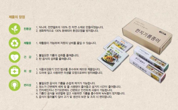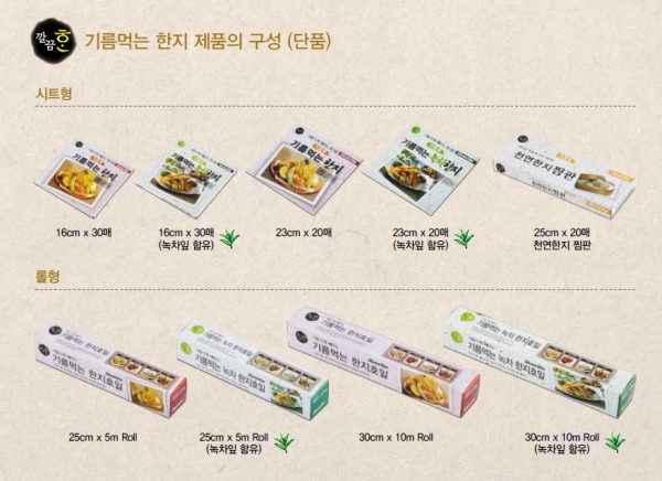 -상품소개 및 정보 : 천연한지를 이용하여 국내 최초 특허 받은 제품으로 화학약품을 쓰지 않은 천연한지 식품용 기름종이 입니다.